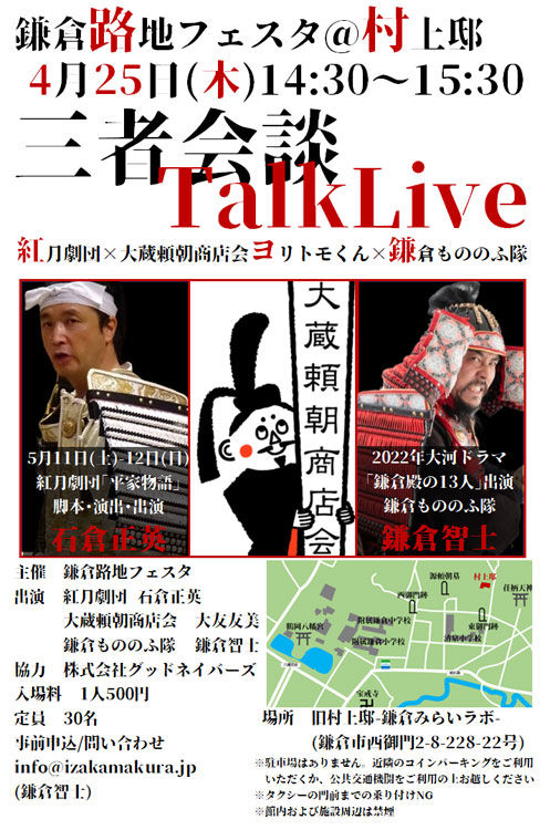 村上邸 紅月劇団、大蔵頼朝商店会ヨリトモくん、鎌倉もののふ隊の三者会談 日程:4/25(木)14:30~15:30